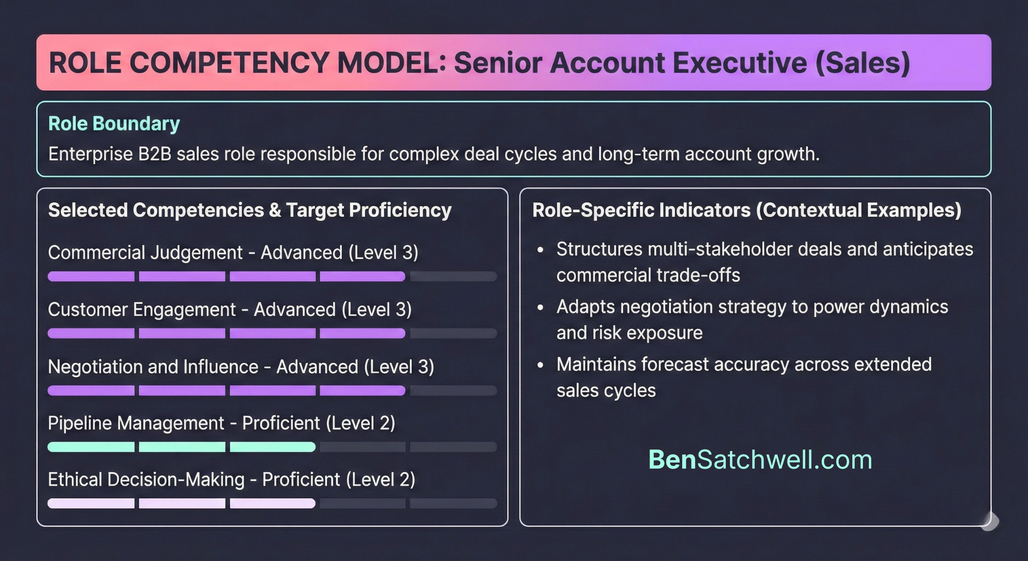 To make this concrete, here is what a clean, defensible competency model looks like when applied to a role.